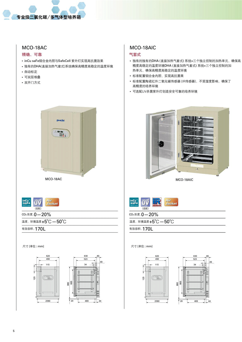 PHcbi專業級二氧化碳/多氣體型培養箱MCO-18M 容量大、功能全 ·獨有的DHA(直接加熱氣套式)系統+三個獨立控制的加熱單元, ·確保高精度高穩定的溫度環境 ·長壽命的氧氣傳感器+IR傳感器,可實現穩定,精準的培養環境 ·標準配置銅合金內膽,高效抗菌 ·可選配UV殺菌紫外燈及自動二氧化碳氣瓶切換開關